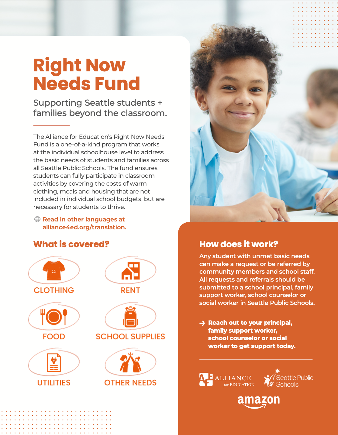 Founded in 2018, the Right Now Needs Fund is an Alliance for Education program that works at the individual school level to support the immediate basic needs of students and families in Seattle Public Schools. The Right Now Needs Fund supports immediate, basic needs like clothing, meals, shelter, utilities and more. If you or someone you know has an unmet basic need, please reach out to your Seattle Public Schools principal, family support worker or school counselor.